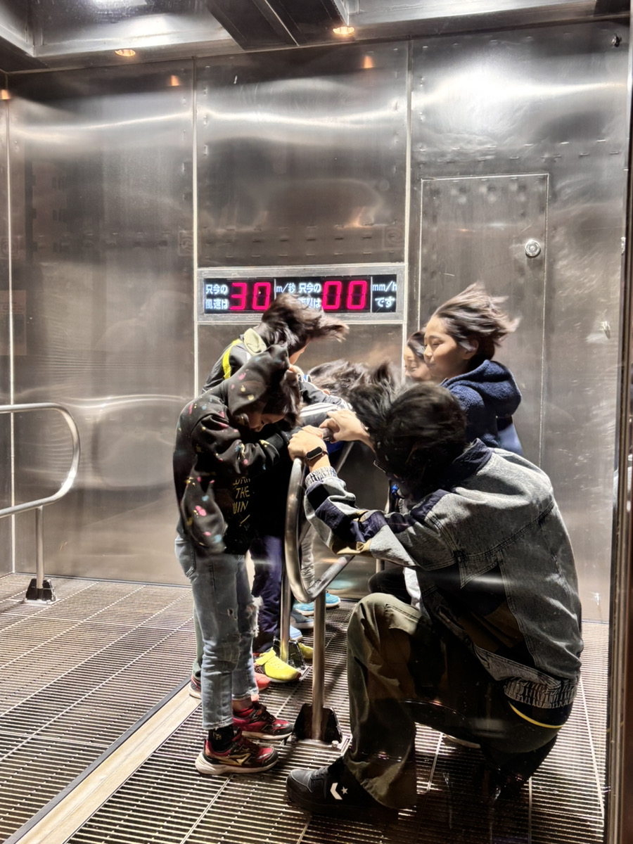 台風と同じくらいの風と聞き、体験する前からドキドキの子どもたち。
