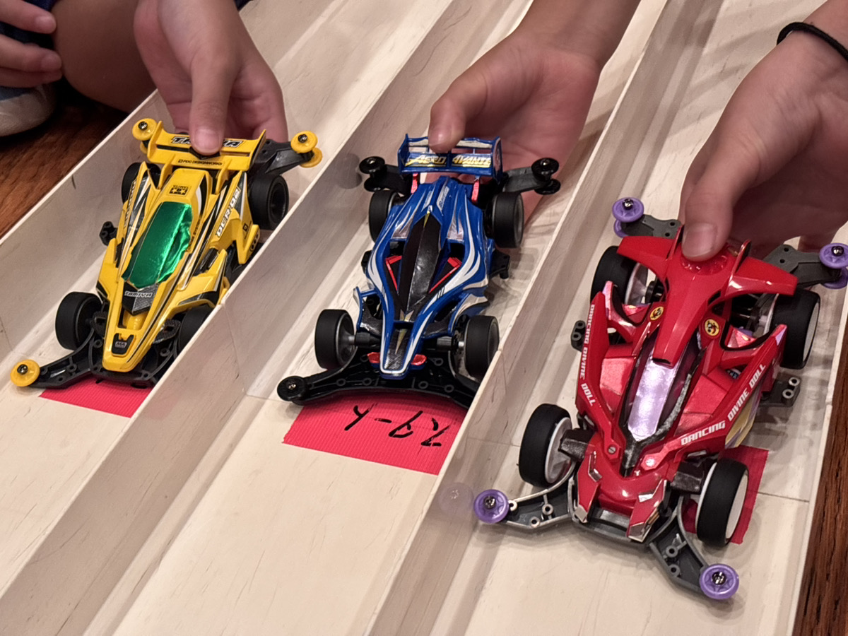 抑えたり、去年作ったミニ四駆をレーンで走らせたりと、子どもたちなりに本番のレースで