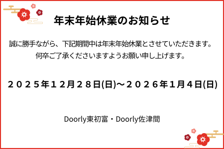 2025年11月25日 年末年始休業のお知らせ 誠に勝手ながら、2025年12月28日(日)~2026年1月4日(日)は年末年始休業とさせていただきます。 何卒ご了承くださいますようお願い申し上げます。続きを読む